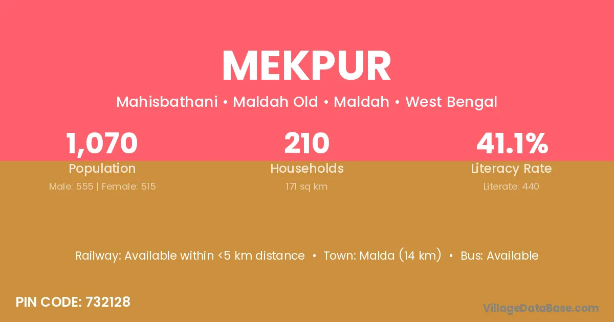 Malda (14 km) is the nearest town to Mekpur village for major economic activities and is located approximately 14 km away.