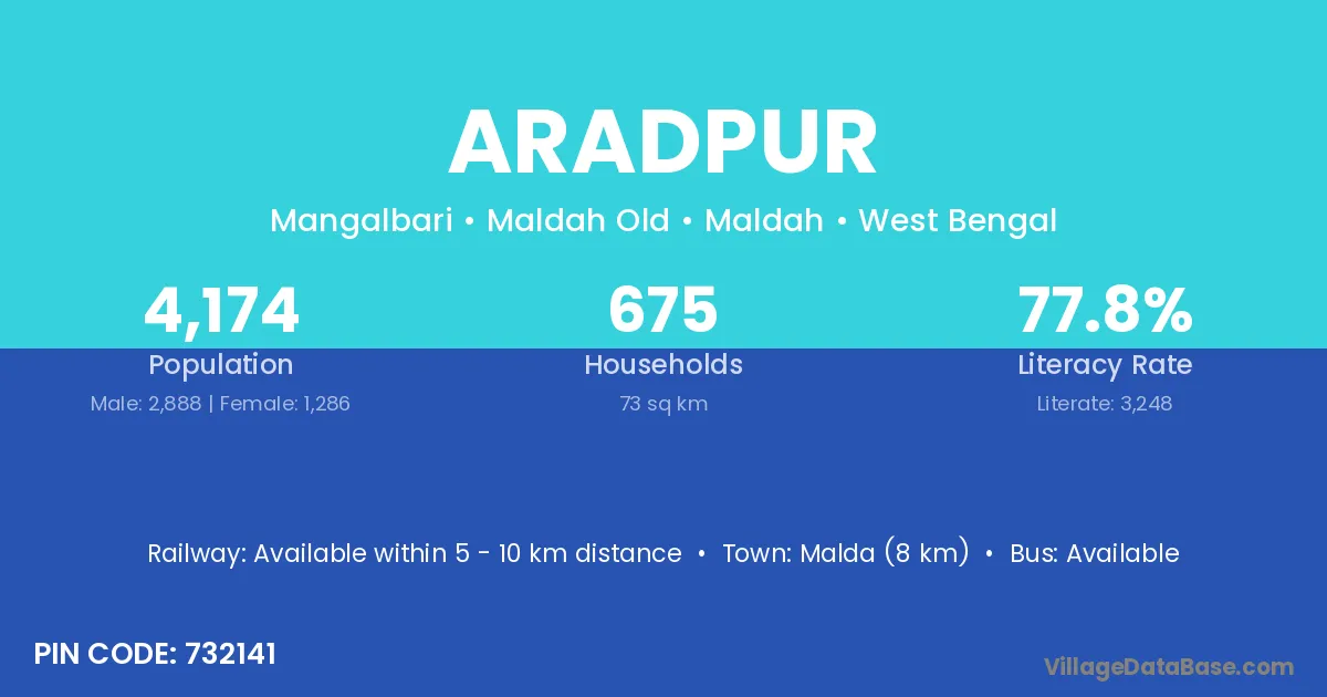 Malda (8 km) is the nearest town to Aradpur village for major economic activities and is located approximately 8 km away.