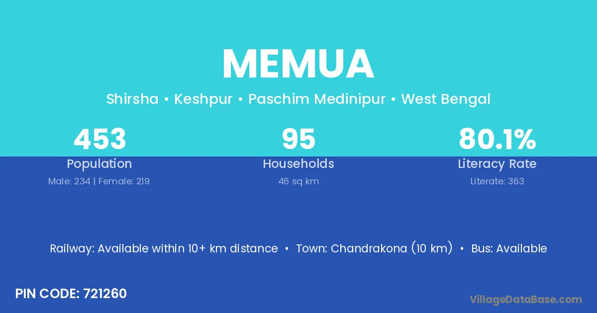 Malda (10 km) is the nearest town to Memua village for major economic activities and is located approximately 10 km away.