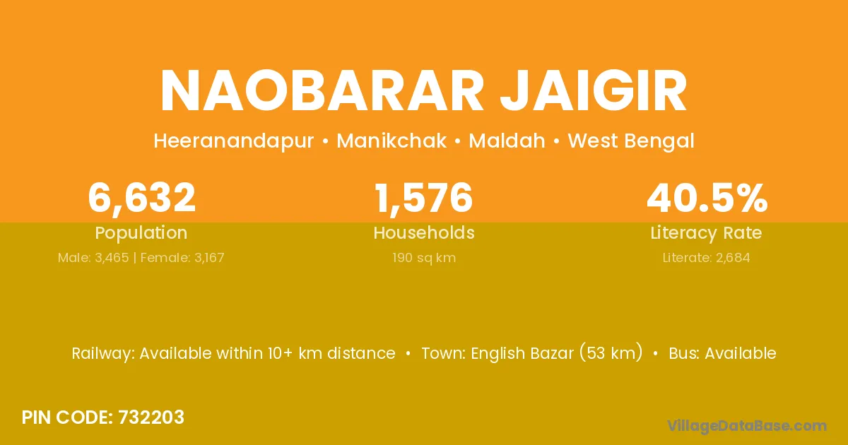 English Bazar (53 km) is the nearest town to Naobarar Jaigir village for major economic activities and is located approximately 53 km away.
