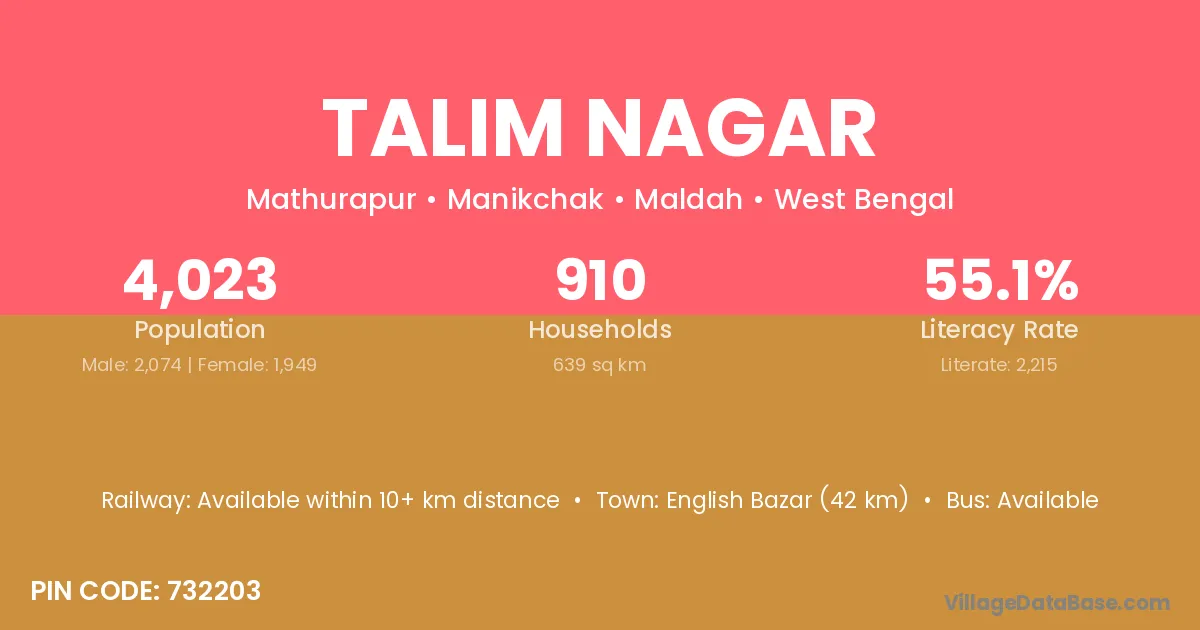 English Bazar (42 km) is the nearest town to Talim Nagar village for major economic activities and is located approximately 42 km away.