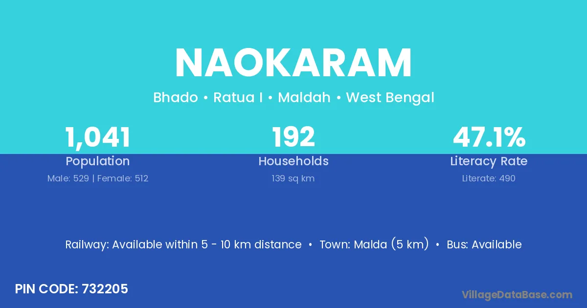 Malda (5 km) is the nearest town to Naokaram village for major economic activities and is located approximately 5 km away.