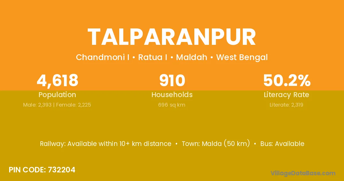 Malda (50 km) is the nearest town to Talparanpur village for major economic activities and is located approximately 50 km away.