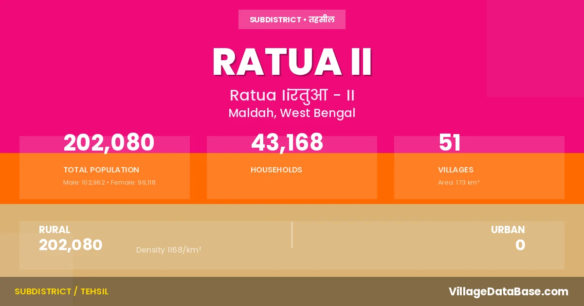 Ratua II is a town and Subdivision in the Maldah district of the West Bengal. In India, a Subdivision is a subdivision of a district responsible for the administration and revenue collection of a specific area within the district. Subdivisions play a crucial role in the local governance structure, contributing significantly to the development and administration of their communities.