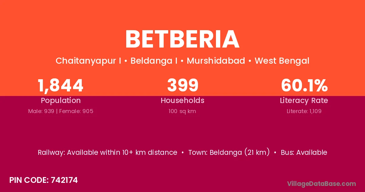 Beldanga (21 km) is the nearest town to Betberia village for major economic activities and is located approximately 21 km away.