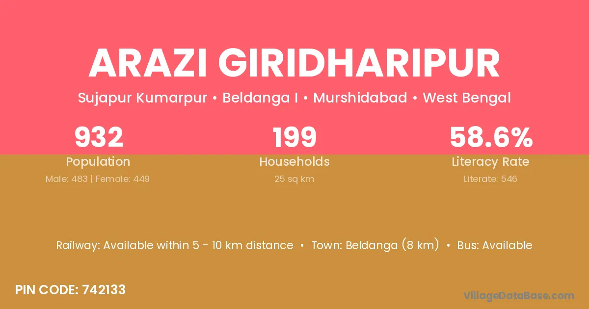 Beldanga (8 km) is the nearest town to Arazi Giridharipur village for major economic activities and is located approximately 8 km away.