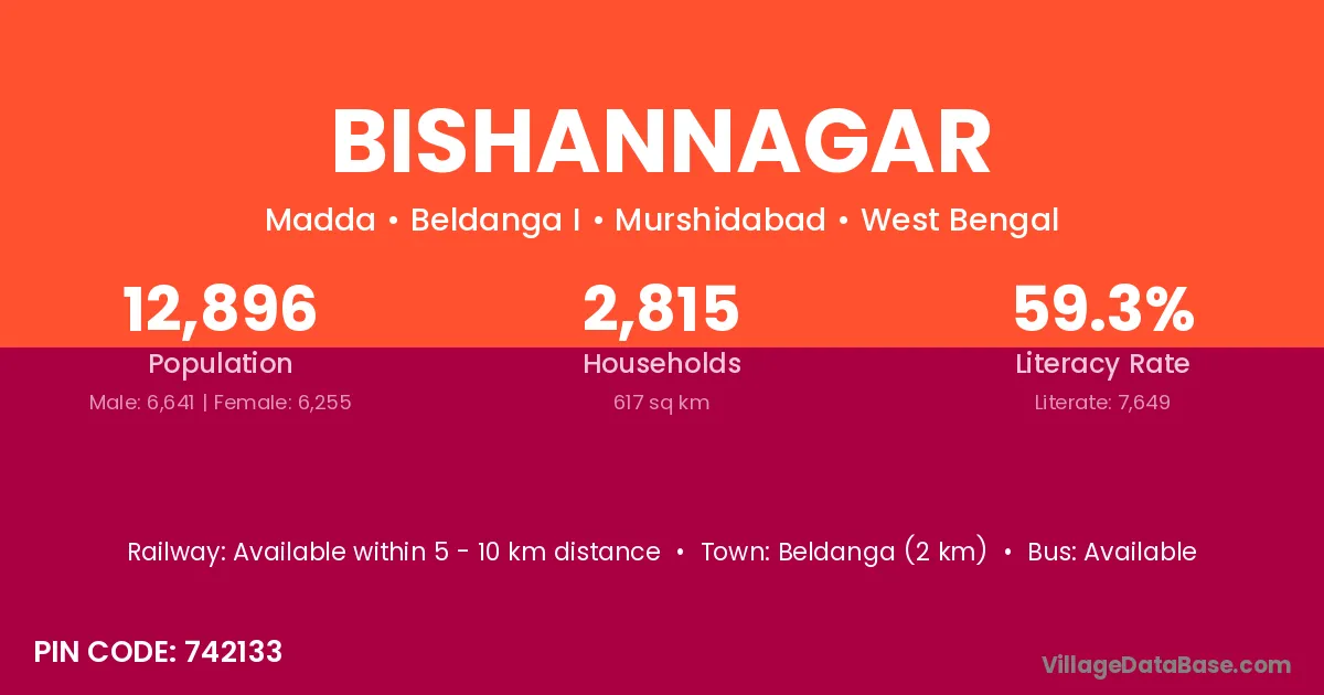 Beldanga (2 km) is the nearest town to Bishannagar village for major economic activities and is located approximately 2 km away.