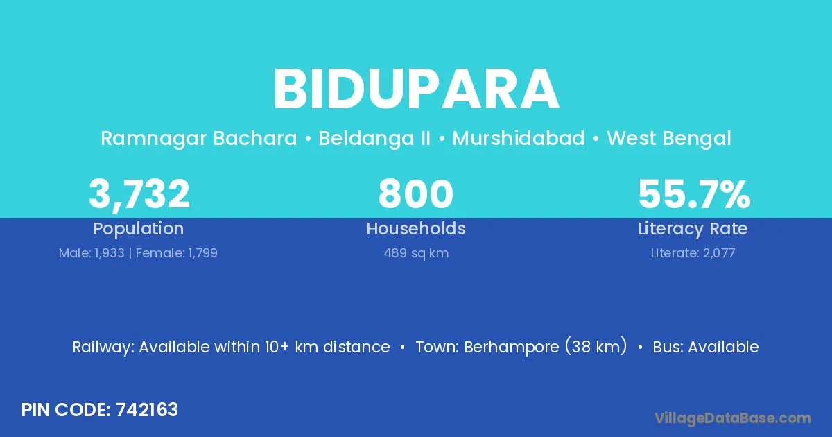Berhampore (38 km) is the nearest town to Bidupara village for major economic activities and is located approximately 38 km away.
