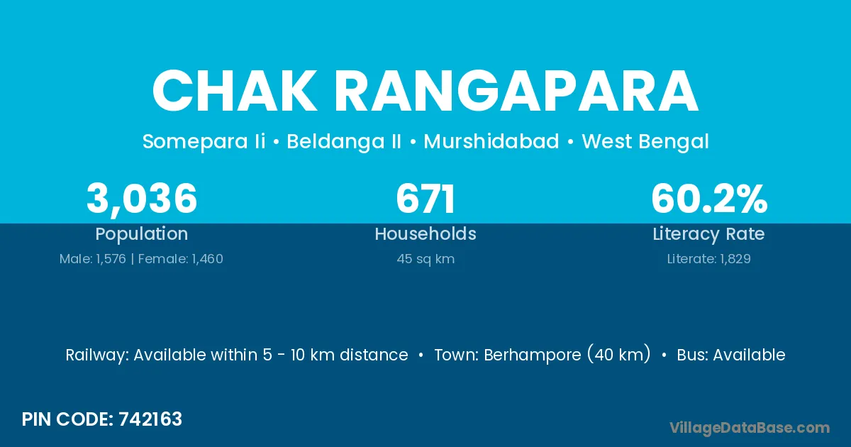 Berhampore (40 km) is the nearest town to Chak Rangapara village for major economic activities and is located approximately 40 km away.