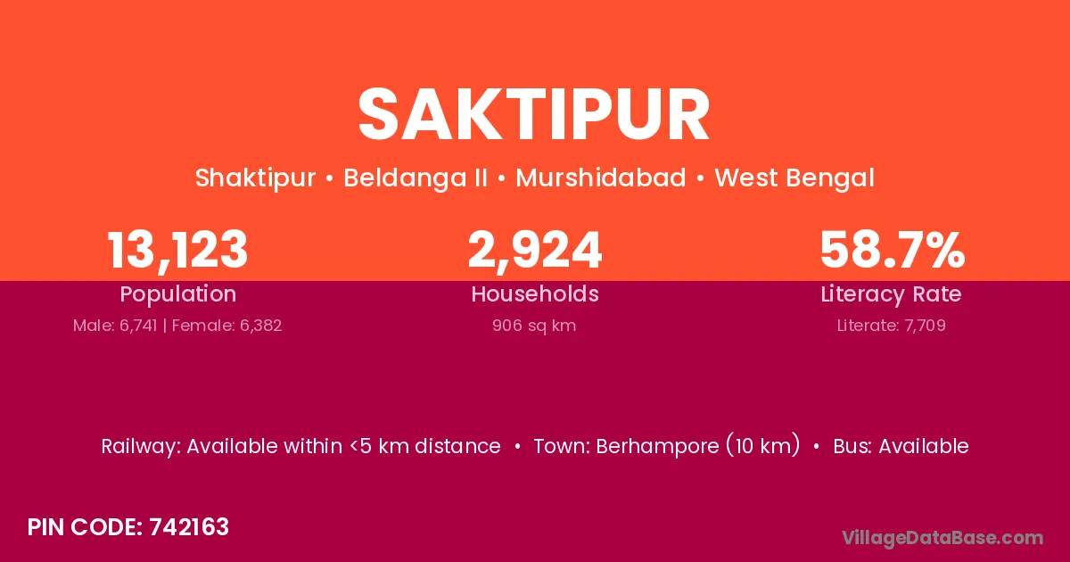 Berhampore (10 km) is the nearest town to Saktipur village for major economic activities and is located approximately 10 km away.