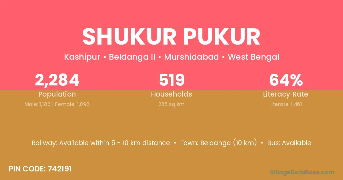 Beldanga (10 km) is the nearest town to Shukur Pukur village for major economic activities and is located approximately 10 km away.