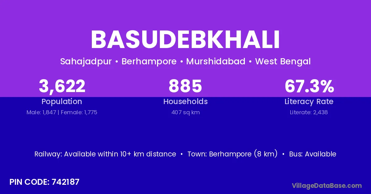 Berhampore (8 km) is the nearest town to Basudebkhali village for major economic activities and is located approximately 8 km away.