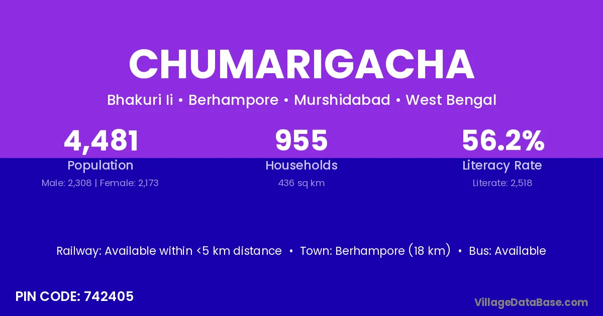Berhampore (18 km) is the nearest town to Chumarigacha village for major economic activities and is located approximately 18 km away.