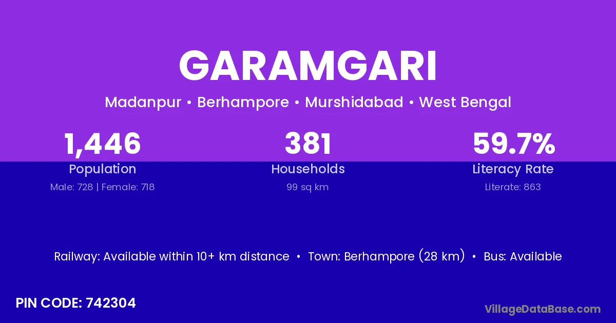 Berhampore (28 km) is the nearest town to Garamgari village for major economic activities and is located approximately 28 km away.