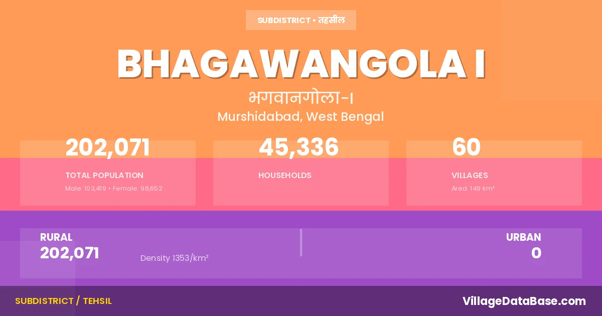 According to the 2011 census The total area of Bhagawangola I Subdivision is 149 km², with a population of 202071 people. The population density is 1,353 inhabitants per square kilometre, and there are approximately 45336 houses in the sub district.