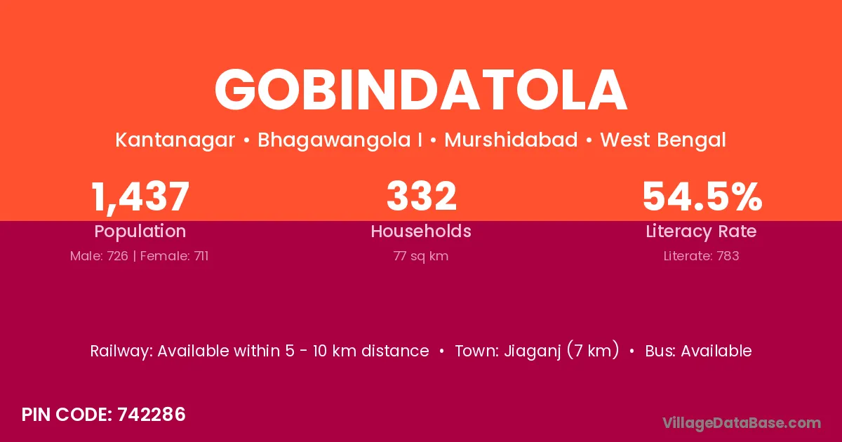 Jiaganj (7 km) is the nearest town to Gobindatola village for major economic activities and is located approximately 7 km away.