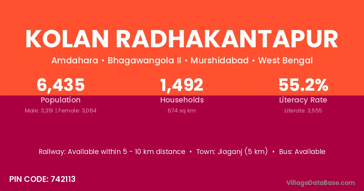 Jiaganj (5 km) is the nearest town to Kolan Radhakantapur village for major economic activities and is located approximately 5 km away.