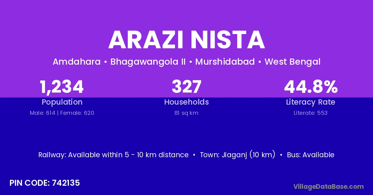 Jiaganj (10 km) is the nearest town to Arazi Nista village for major economic activities and is located approximately 10 km away.