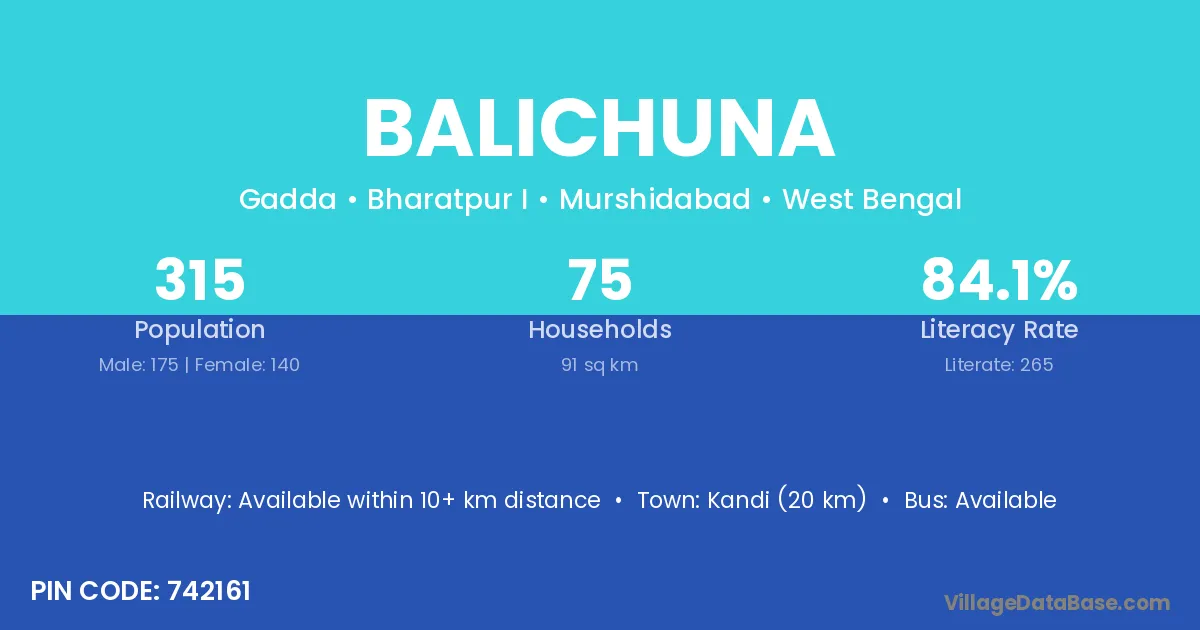 Kandi (20 km) is the nearest town to Balichuna village for major economic activities and is located approximately 20 km away.