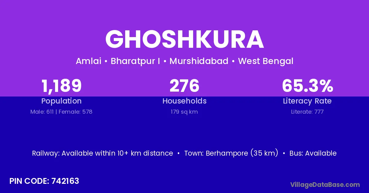 Berhampore (35 km) is the nearest town to Ghoshkura village for major economic activities and is located approximately 35 km away.