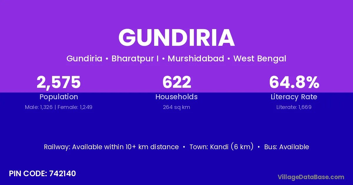 Kandi (6 km) is the nearest town to Gundiria village for major economic activities and is located approximately 6 km away.