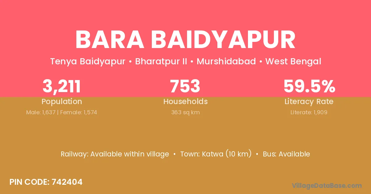 Katwa (10 km) is the nearest town to Bara Baidyapur village for major economic activities and is located approximately 10 km away.
