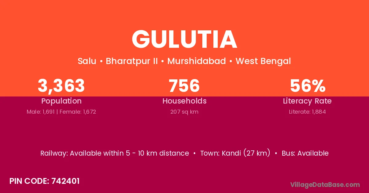 Kandi (27 km) is the nearest town to Gulutia village for major economic activities and is located approximately 27 km away.