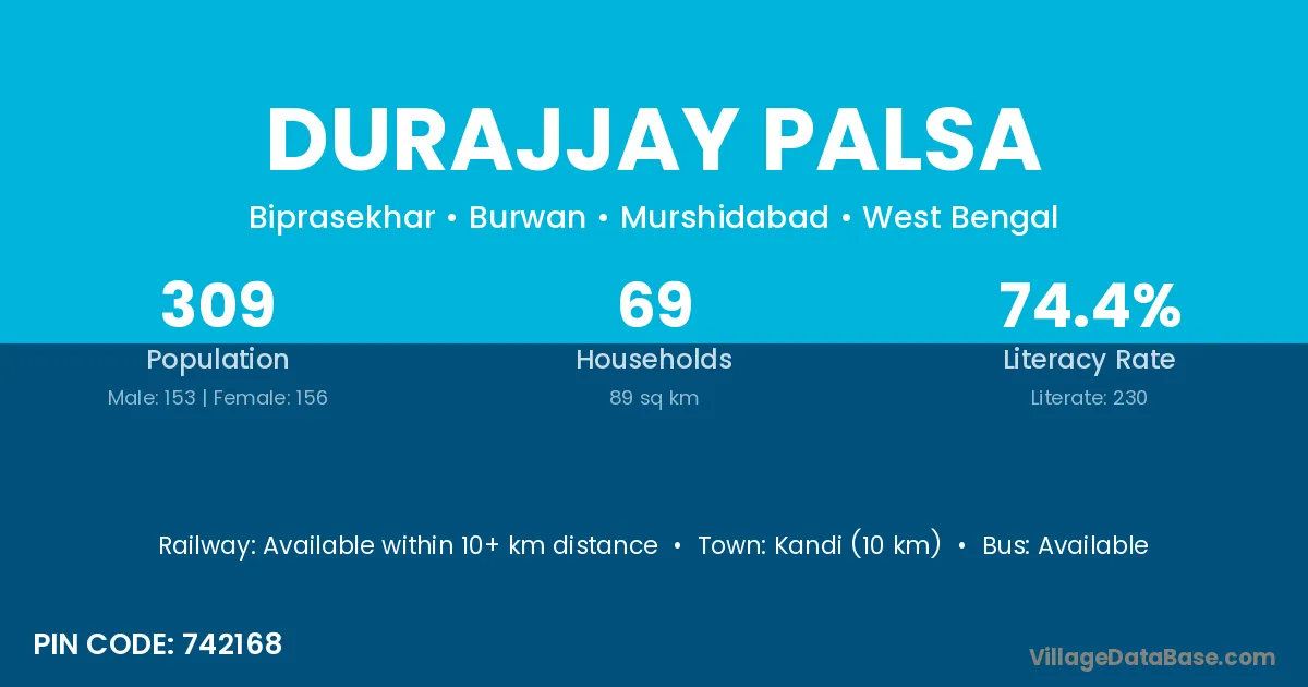 Kandi (10 km) is the nearest town to Durajjay Palsa village for major economic activities and is located approximately 10 km away.