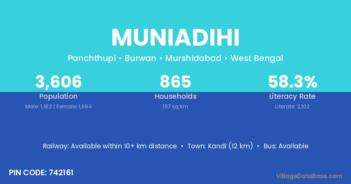 Kandi (12 km) is the nearest town to Muniadihi village for major economic activities and is located approximately 12 km away.