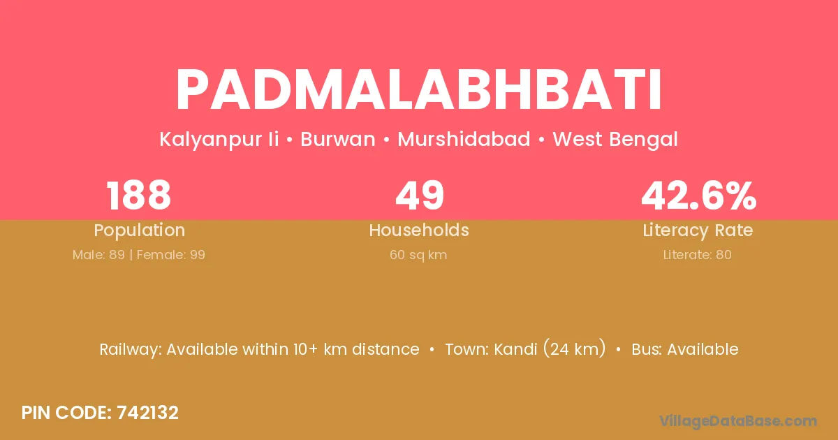 Kandi (24 km) is the nearest town to Padmalabhbati village for major economic activities and is located approximately 24 km away.