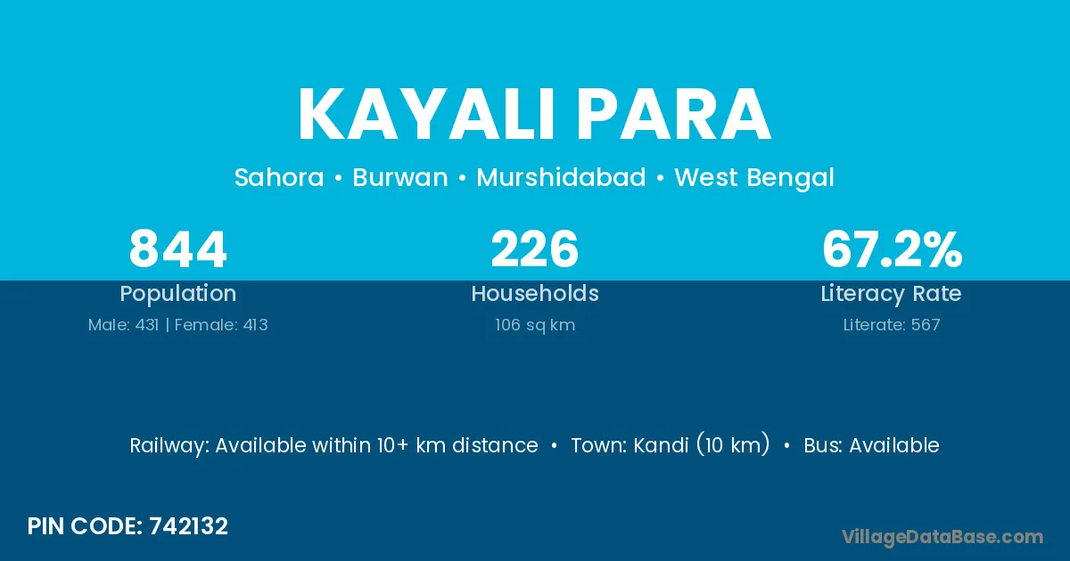Kandi (10 km) is the nearest town to Kayali Para village for major economic activities and is located approximately 10 km away.