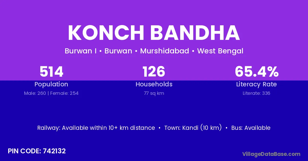 Kandi (10 km) is the nearest town to Konch Bandha village for major economic activities and is located approximately 10 km away.