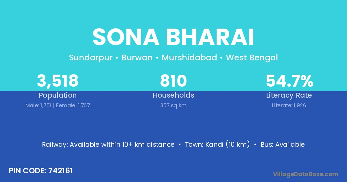 Kandi (10 km) is the nearest town to Sona Bharai village for major economic activities and is located approximately 10 km away.