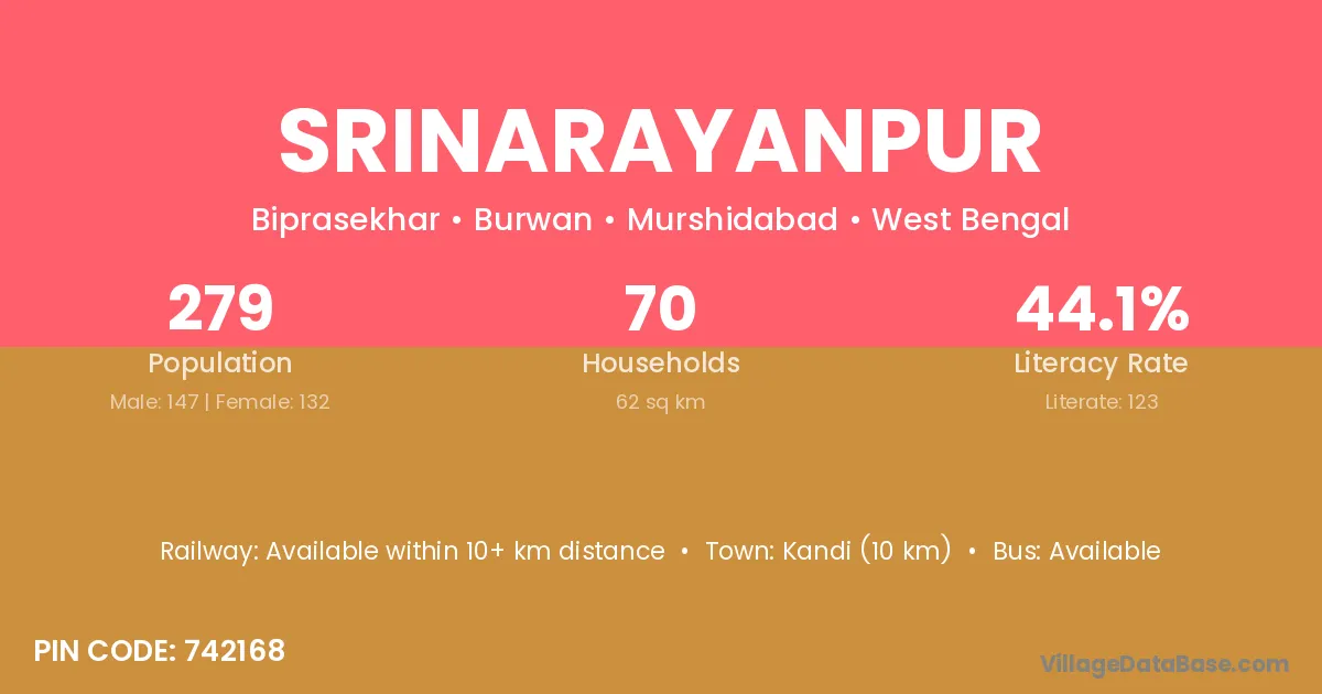 Kandi (10 km) is the nearest town to Srinarayanpur village for major economic activities and is located approximately 10 km away.