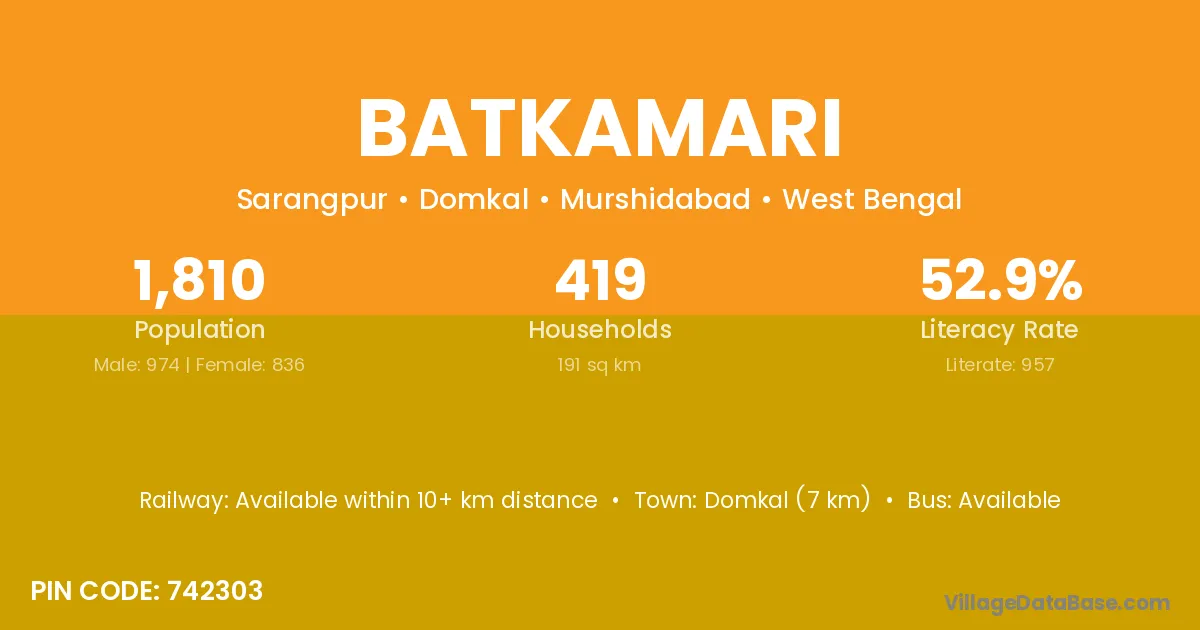 Domkal (7 km) is the nearest town to Batkamari village for major economic activities and is located approximately 7 km away.