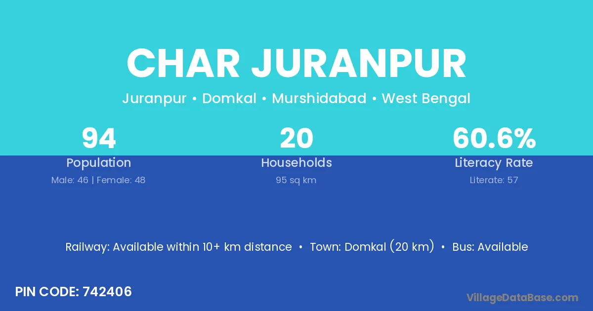 Domkal (20 km) is the nearest town to Char Juranpur village for major economic activities and is located approximately 20 km away.