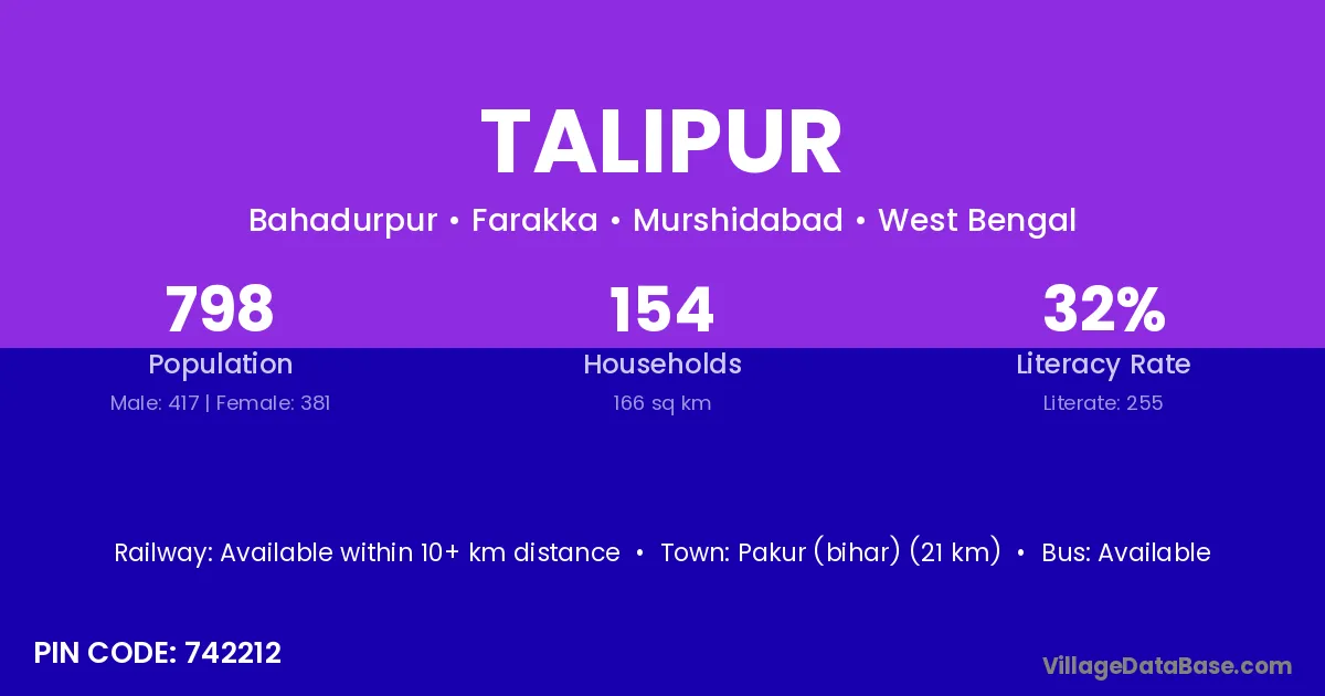 According to Census 2011 information, the village code of Talipur village is 742212.