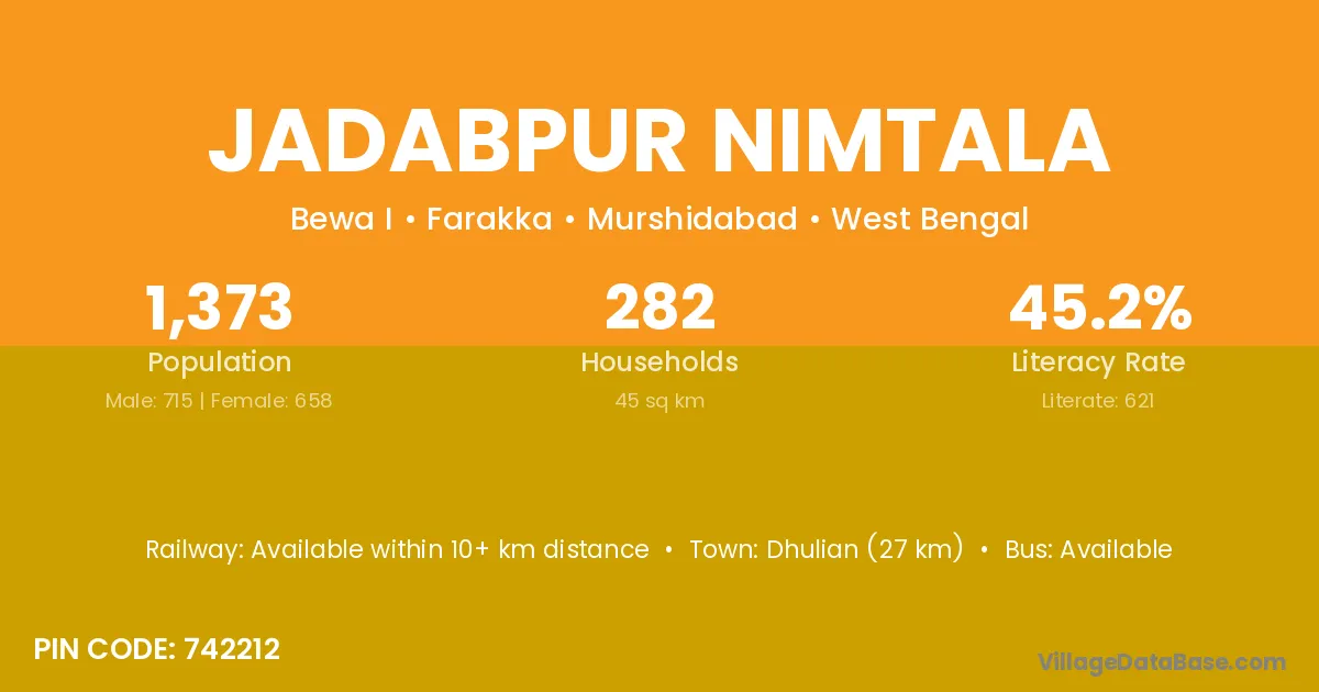 Dhulian (27 km) is the nearest town to Jadabpur Nimtala village for major economic activities and is located approximately 27 km away.