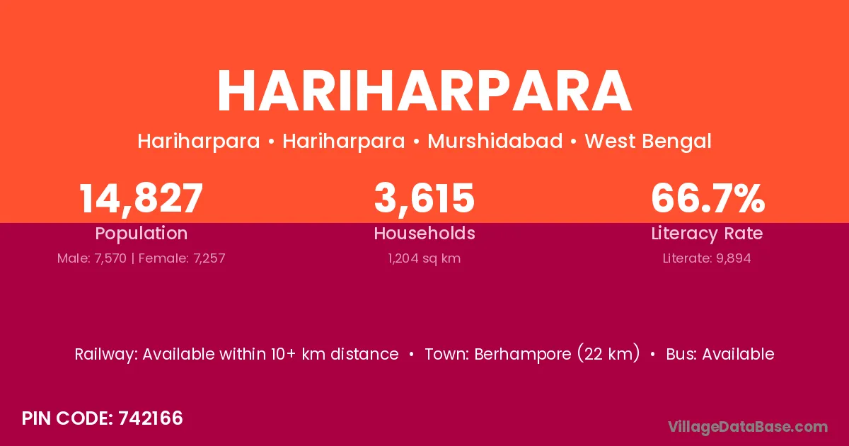 Berhampore (22 km) is the nearest town to Hariharpara village for major economic activities and is located approximately 22 km away.