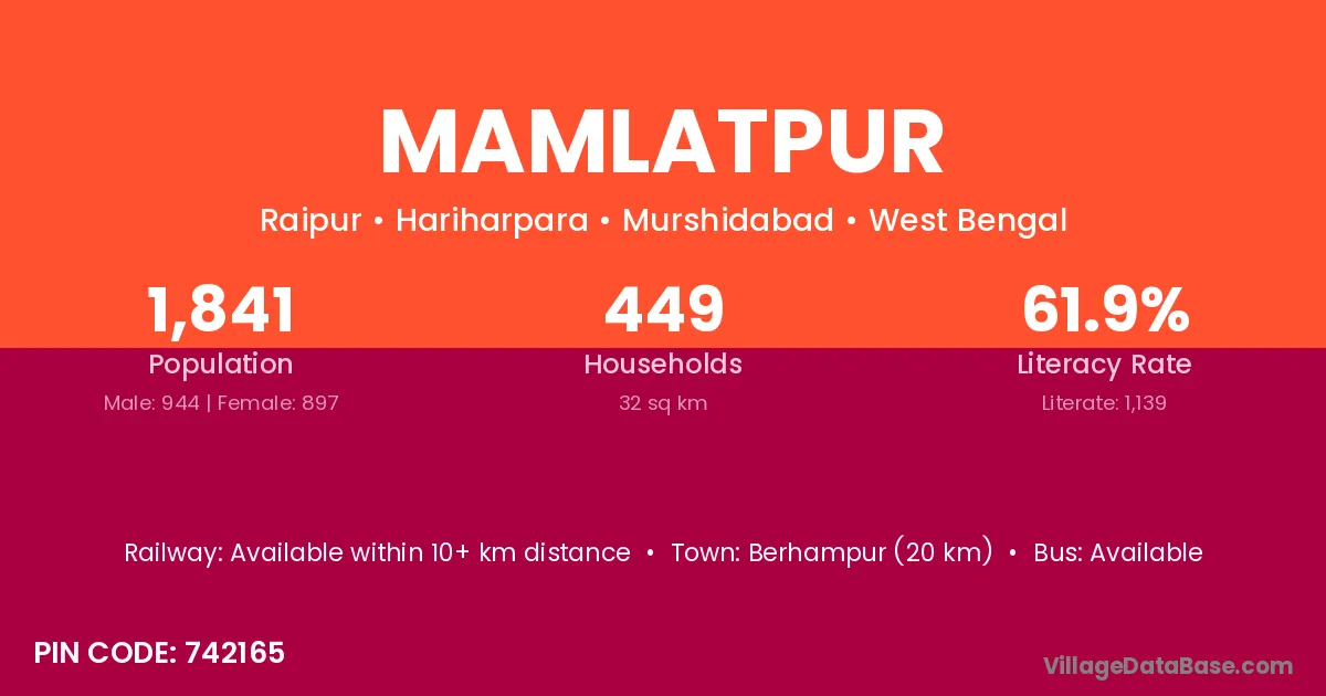 Berhampur (20 km) is the nearest town to Mamlatpur village for major economic activities and is located approximately 20 km away.