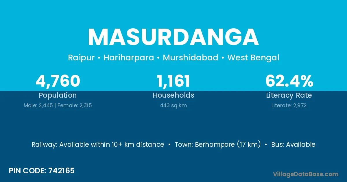 Berhampore (17 km) is the nearest town to Masurdanga village for major economic activities and is located approximately 17 km away.
