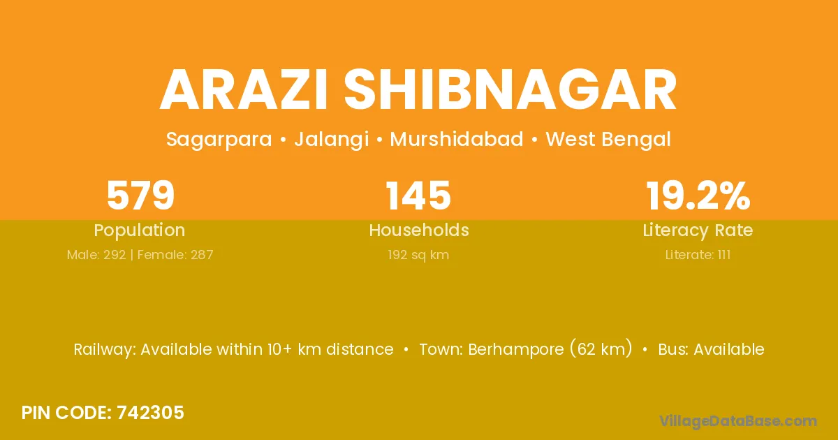 Berhampore (62 km) is the nearest town to Arazi Shibnagar village for major economic activities and is located approximately 62 km away.