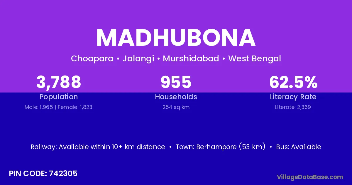 Berhampore (53 km) is the nearest town to Madhubona village for major economic activities and is located approximately 53 km away.