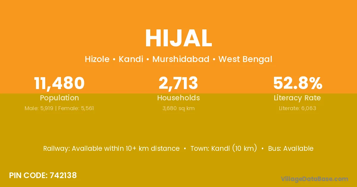 Kandi (10 km) is the nearest town to Hijal village for major economic activities and is located approximately 10 km away.