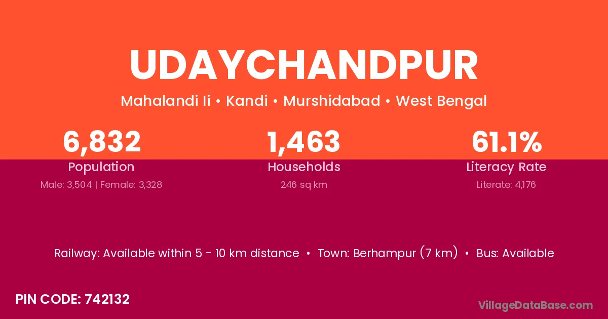 Udaychandpur village has a total population of 6,832 people, of which 3,504 are males and 3,328 are females.