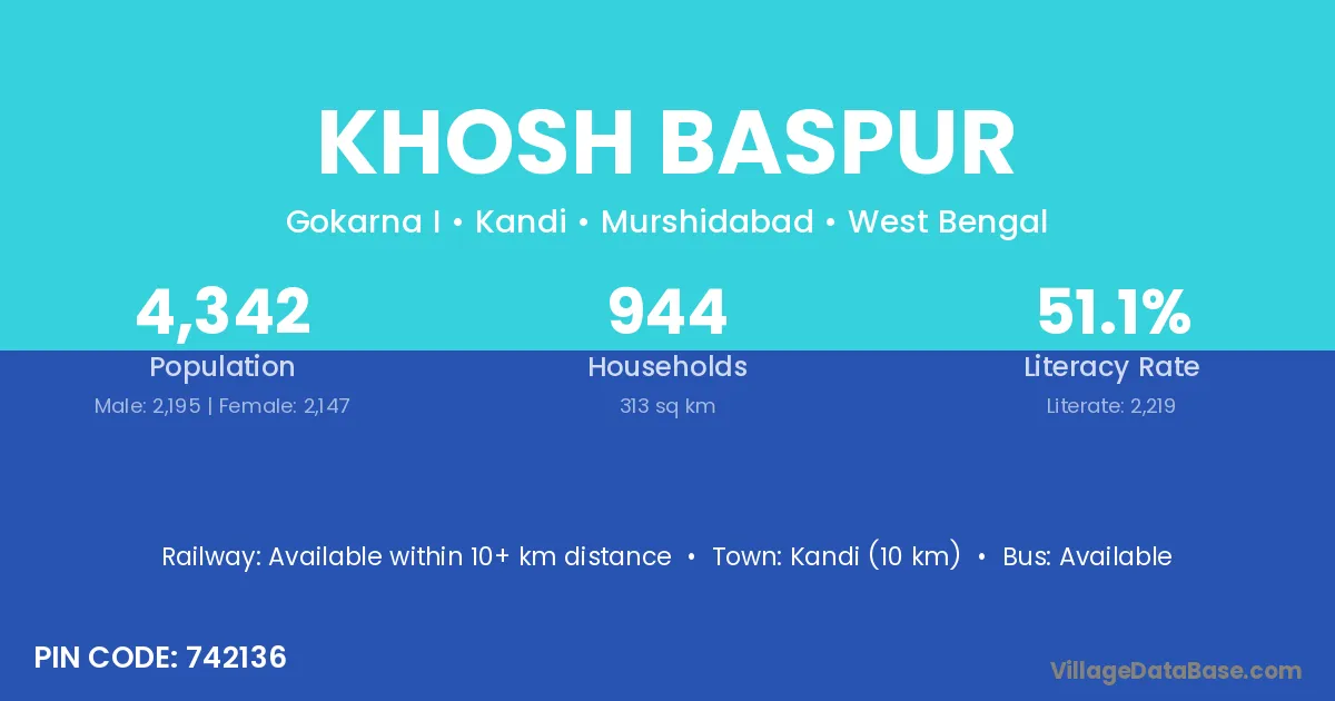 Kandi (10 km) is the nearest town to Khosh Baspur village for major economic activities and is located approximately 10 km away.