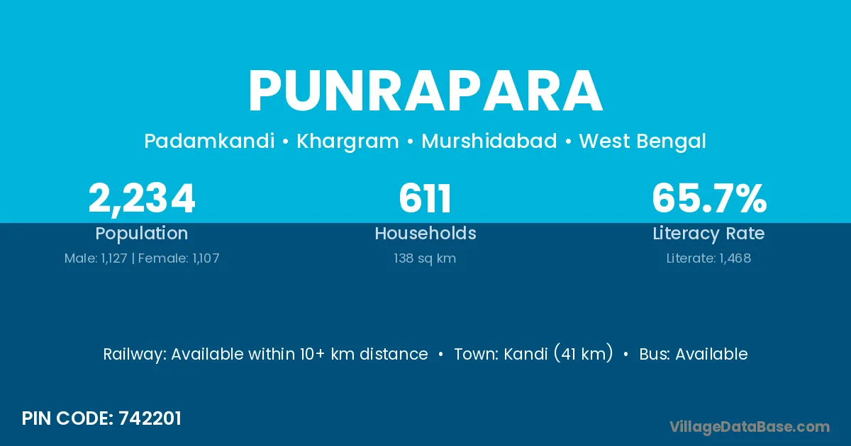 Kandi (41 km) is the nearest town to Punrapara village for major economic activities and is located approximately 41 km away.