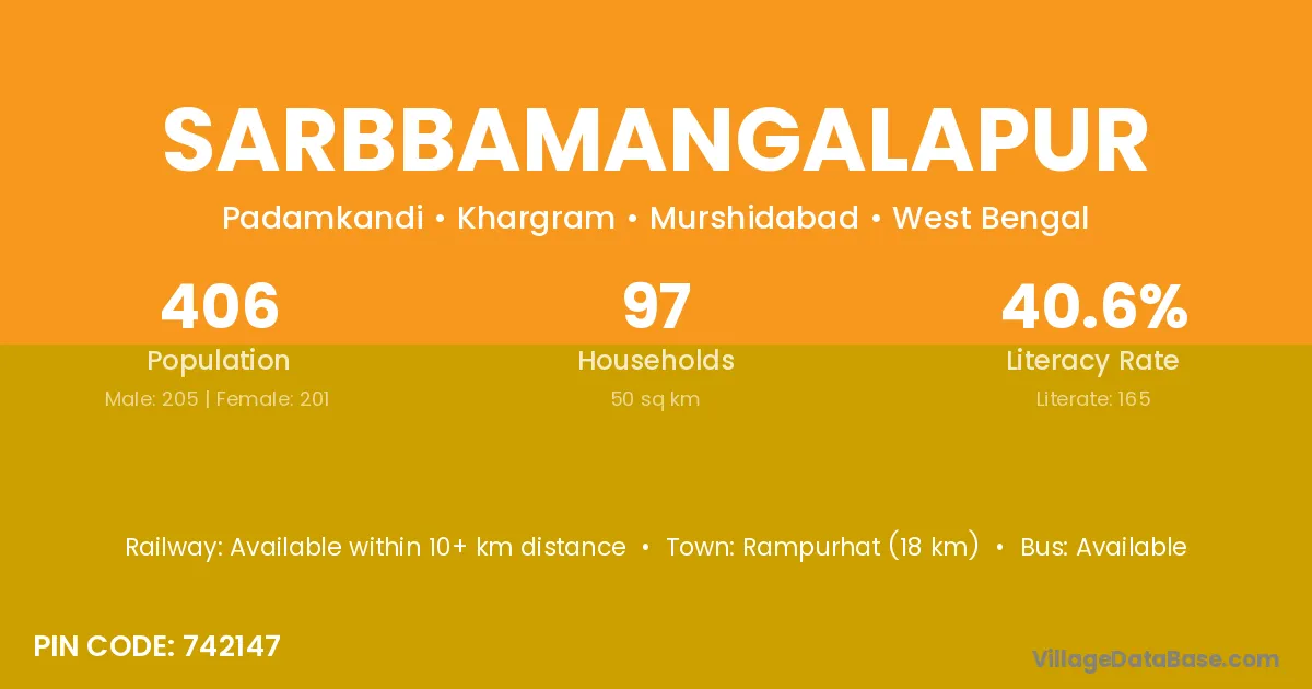 Rampurhat (18 km) is the nearest town to Sarbbamangalapur village for major economic activities and is located approximately 18 km away.