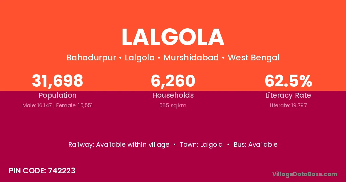 Lalgola village has a total population of 31,698 people, of which 16,147 are males and 15,551 are females.