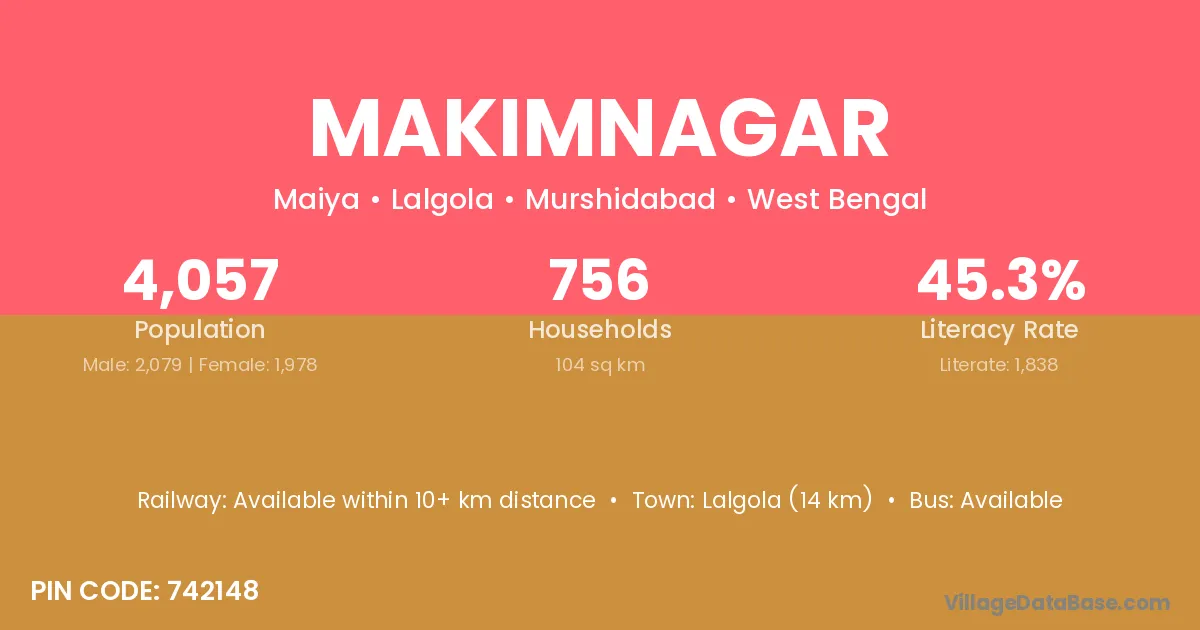 Lalgola (14 km) is the nearest town to Makimnagar village for major economic activities and is located approximately 14 km away.